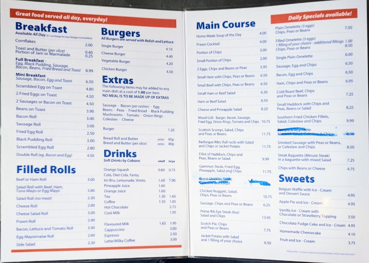 Start your meal with their Homemade Soup of the Day or a classic Prawn Cocktail. The Mixed Grill is a standout, perfect for those craving a hearty feast. For seafood lovers, the Scottish Scampi paired with chips never disappoints. Not to be overlooked are their BBQ Ribs – a full rack served with salad and chips that infuses a smoky flavor in every bite.